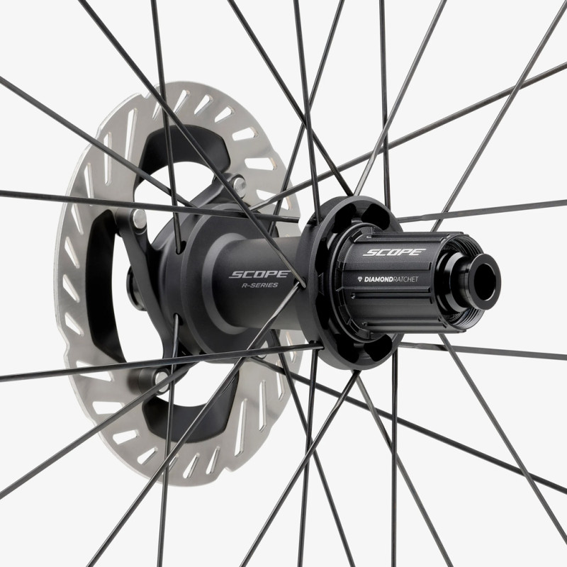 Sa jante à crochets de 23 mm de largeur interne est optimisée pour les pneus à chambre à air et tubeless de 28 mm, pour un équilibre parfait entre résistance au roulement, efficacité et confort. Ces Scope Cycling Race R4 sont renforcées en carbone à certains endroits spéciaux, notamment autour des trous de rayons à l'intérieur de la jante pour plus de résistance et de rigidité. Le moyeu est doté du système Diamond Ratchet SL, composé d’une partie en titane et recouvert d'un revêtement en carbone pour assurer un engagement direct et une durabilité accrue.