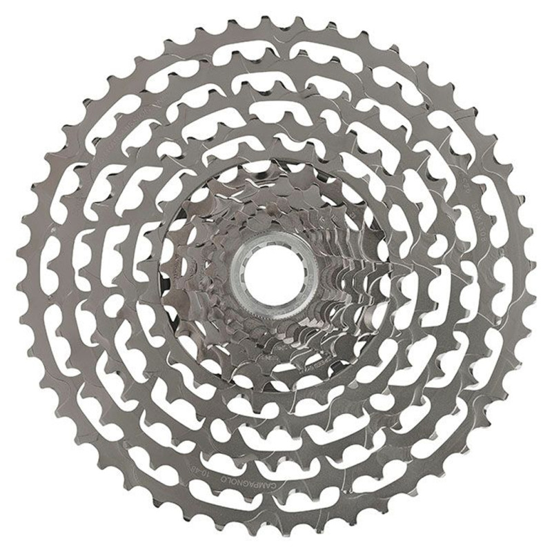 La cassette Campagnolo Super Record X 13 vitesses est directement dérivée du modèle Super Record 2x13, dont elle reprend les performances mécaniques éprouvées. Son étagement a été spécialement recalibré pour une utilisation en monoplateau, garantissant une progression douce, homogène et sans sauts excessifs entre les pignons.