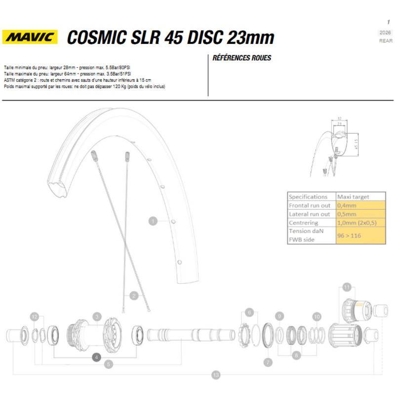 - Pour roue arrière Mavic Cosmic SLR 45 Disc 23mm