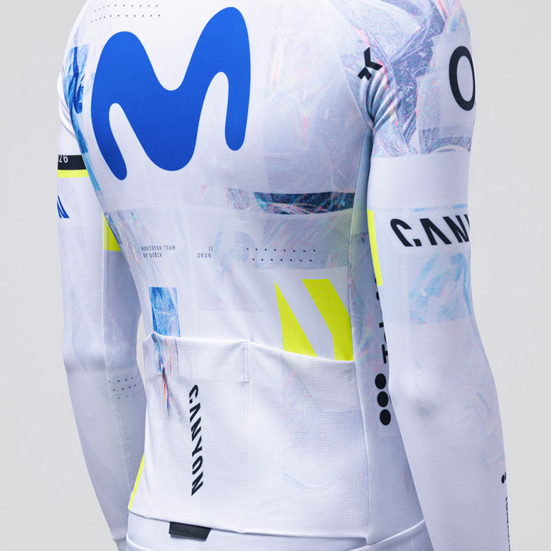 Ce Gobik Hyder Movistar Team 2026 dispose d’un col haut et de poignets élastiques pour offrir une isolation supplémentaire contre le vent, tandis que les poches dorsales offrent suffisamment d'espace pour emporter des barres énergétiques, des gels ou des accessoires essentiels lors des longues sorties d’entraînement. Ce maillot long intègre aussi des éléments réfléchissants pour améliorer la visibilité par faible luminosité.
