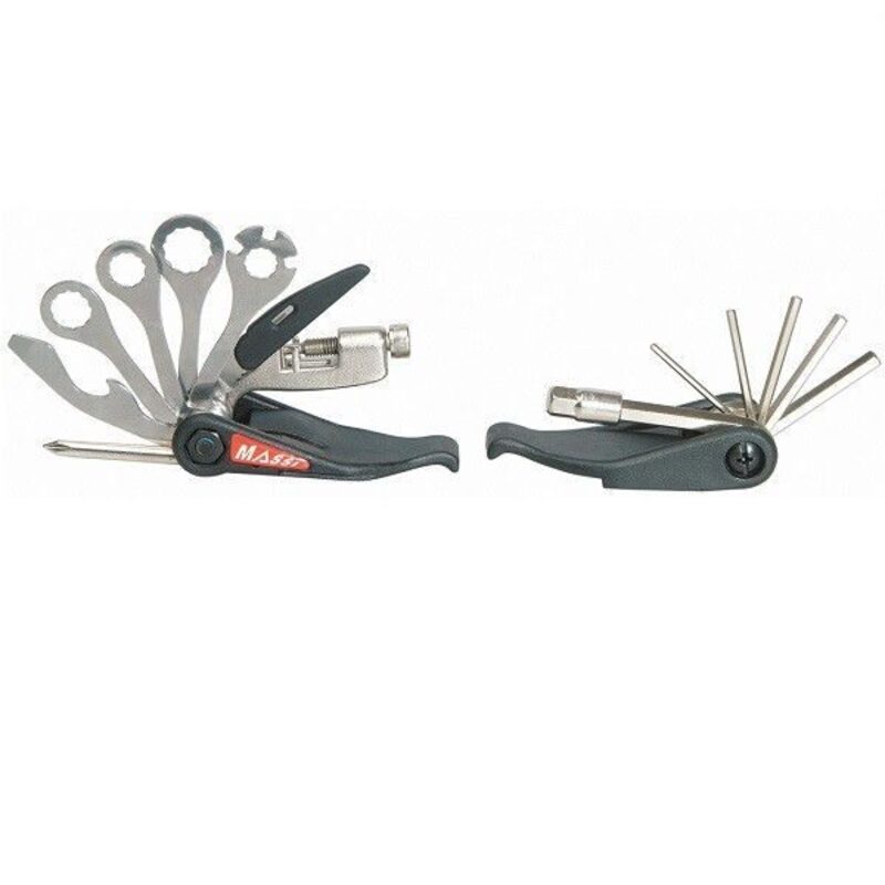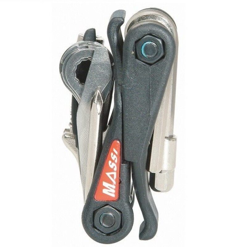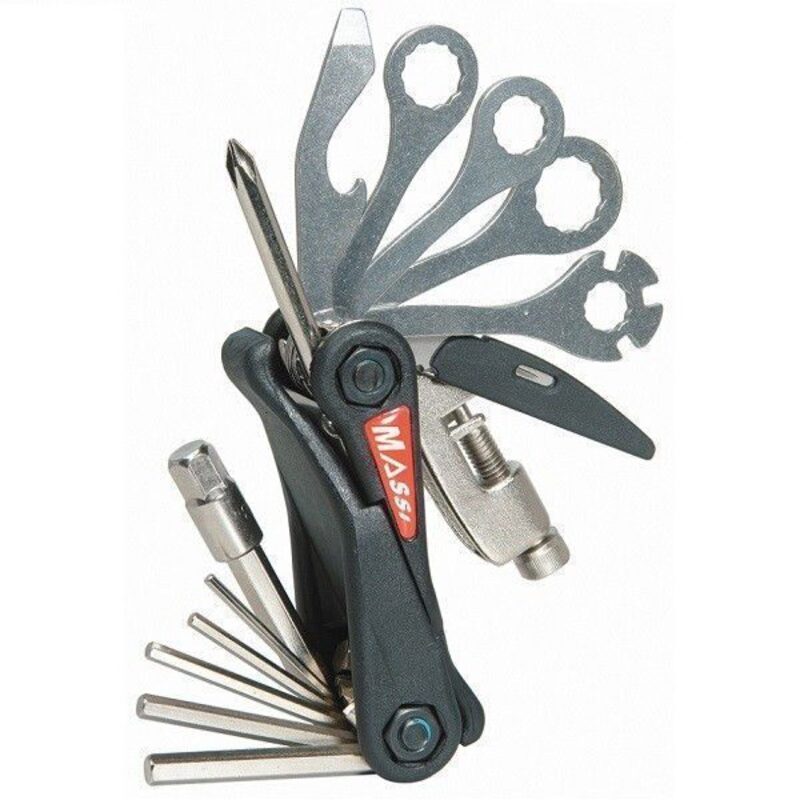 Dieses klappbare Werkzeug von Massi ist mit einem Kettenabzieher, Sechskantschlüsseln 2, 2,5, 3, 4, 5, 6 und 8 mm, einem Kreuz- und einem Schlitzschraubendreher, einem Reifenheber, einem Speichenschlüssel und als Sahnehäubchen einem Messer und einem Flaschenöffner ausgestattet!