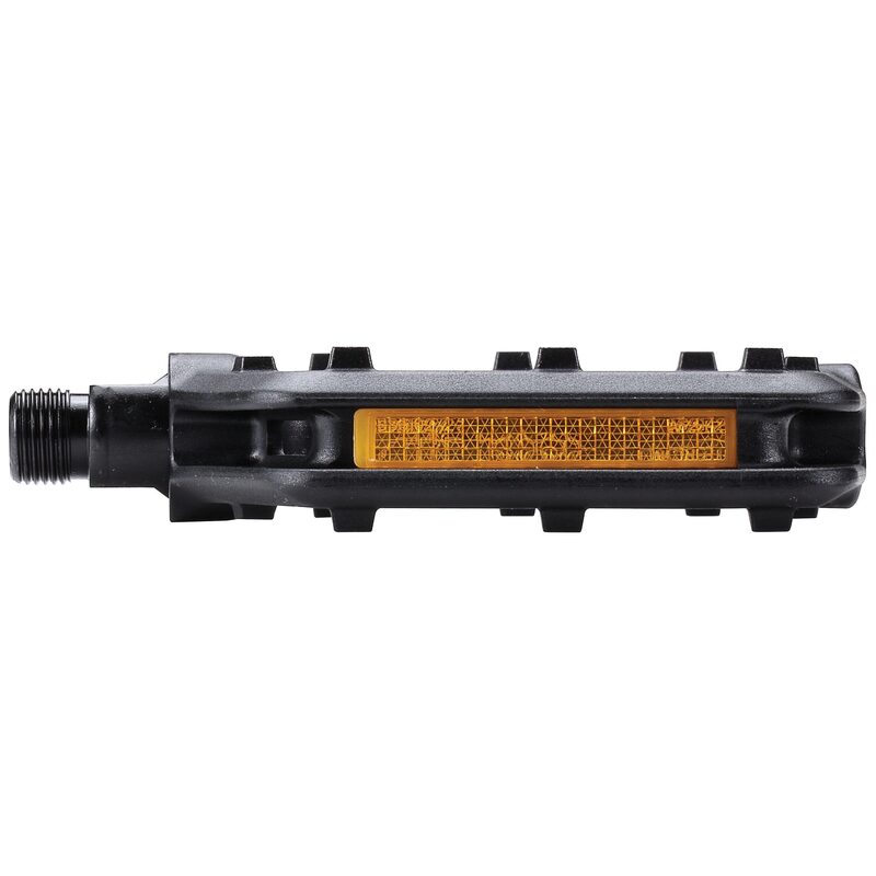 Ein Paar ultraleichte BBB-Pedale aus Verbundmaterial. Sie sind auf beiden Seiten mit rutschfesten Noppen sowie Rückstrahlern ausgestattet, um eine optimale Sichtbarkeit bei Nacht zu gewährleisten.