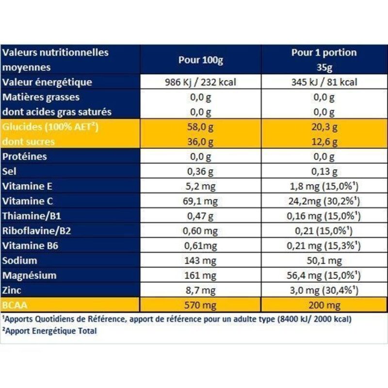 Zitrusgeschmack : Glukosesirup, Wasser, Maltodextrin, Fruktose, Mineralstoffe (Magnesiumcitrat, Zinkgluconat), natürliche Aromen von Grapefruit, Orange und Zitrone, verzweigtkettige Aminosäuren (L-Leucin, L-Isoleucin, L-Valin), Salz, Säureregulator (Zitronensäure), Vitamine (C, E, B6, B1, B2), Konservierungsmittel (Kaliumsorbat).