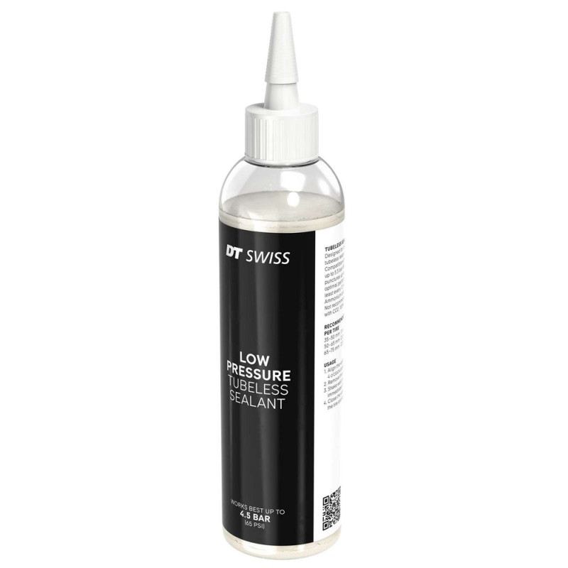 DT Swiss erweitert sein Sortiment an spezifischen Felgen und Ventilen für Tubeless-Reifen um vorbeugende Produkte. Diese 240-ml-Tube DT Swiss Low Pressure Tubeless Sealant ist für niedrige Drücke bis zu 4,5 bar für den Einsatz bei Gravel- und Mountainbikes vorgesehen. Dieses Dichtmittel dient zum Verschließen von Löchern bis zu 6 mm.