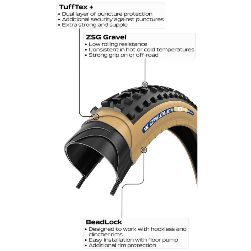 - TuffTex+: TuffTex+ ist eine revolutionäre Reifenstruktur, die speziell für GravelKing-Reifen entwickelt wurde. Sie bietet Langlebigkeit und Pannenschutz dank ihrer doppelten Karkasse und zusätzlichen Pannenschutzvorrichtungen.
