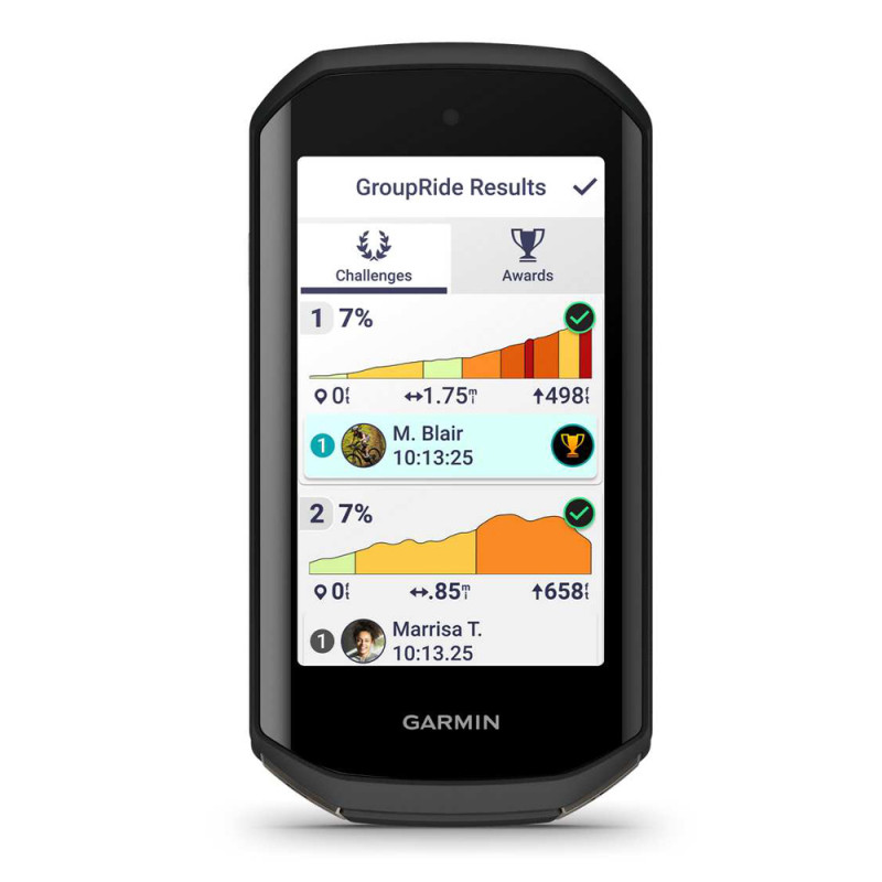 - Fonctions de suivi et de sécurité : Assistance, LiveTrack, GroupTrack, Group Ride (Cycling), Challenges et récompenses GroupRide, Messages de coureur à coureur, Détection d'incident, Détection d'incident GroupRide, Fonction de signalement des dangers par la communauté, Retrouver mon appareil Edge, Alarme vélo, Alertes météo, Compatible avec inReach