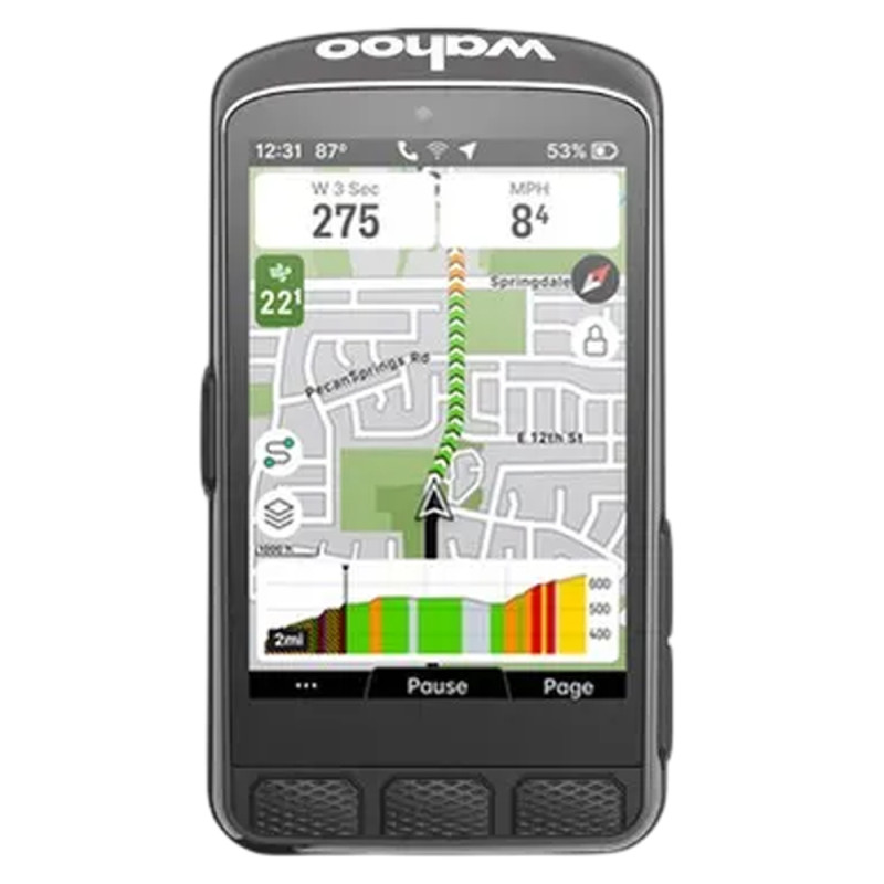 Das Wahoo Fitness Elemnt Ace verbindet die Größe und Ergonomie eines Smartphones mit den spezifischen Funktionen eines Fahrradcomputers. Sein großer 3,8-Zoll-Touchscreen nutzt modernste TFT-Technologie, um unter allen Bedingungen optimale Sichtbarkeit zu gewährleisten. Dieser hochauflösende Bildschirm (DPI) bietet kontrastreiche Farbpaletten und hervorragende Blendschutz-Eigenschaften, damit Sie Ihre Daten immer gut sehen oder Ihre Navigation verfolgen können. An den Seiten des Fahrradcomputers befinden sich physische Tasten für mehr Vielseitigkeit.
