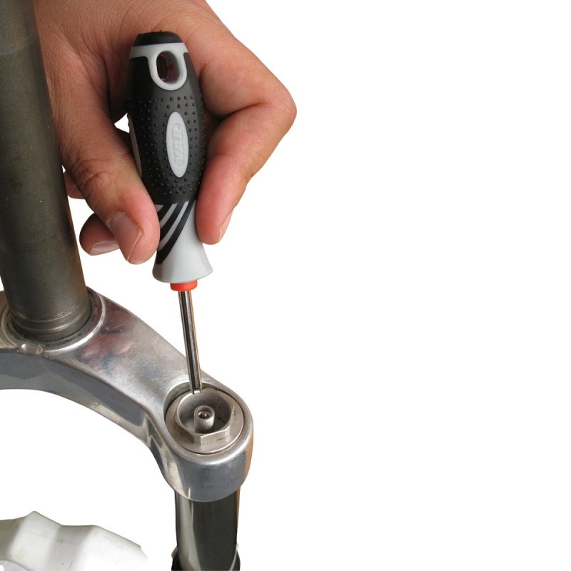 Mit dem Werkzeug Var RP-42400 können Sie ein Schrader-Ventil und/oder ein Federungsventil vom Typ Stoßdämpfer oder Gabel demontieren.