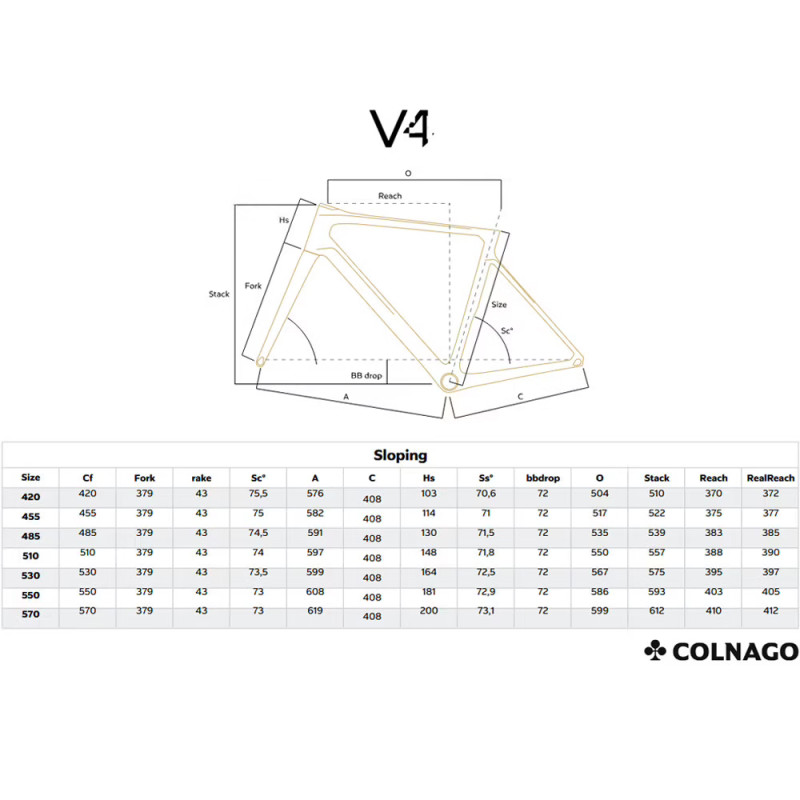 - Vorbau: Colnago SR10/ 90 mm (42), 100 mm (45,5), 110 mm (48,5, 51), 120 mm (53, 55), 130 mm (57)