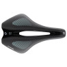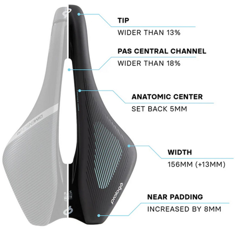 ¤Dieser Sattel hat zwar eine kompakte Länge von 245 mm, ist jedoch breiter (156 mm), um die Auflagefläche für das weibliche Becken zu vergrößern. Die anatomische Mitte wurde um 5 mm nach hinten versetzt, um die Positionierung der Sitzbeinhöcker im hinteren Teil des Sattels zu erleichtern, wo die Polsterung mit Schaumstoff geringerer Dichte maximalen Komfort und Stabilität bietet. Um sich optimal an den Körper der Frau anzupassen, wurde auch der zentrale PAS-Kanal verbreitert, die Polsterung an den Seiten verstärkt, um den Druck auf die Genitalien zu verringern, und die Sattelspitze ebenfalls verbreitert.