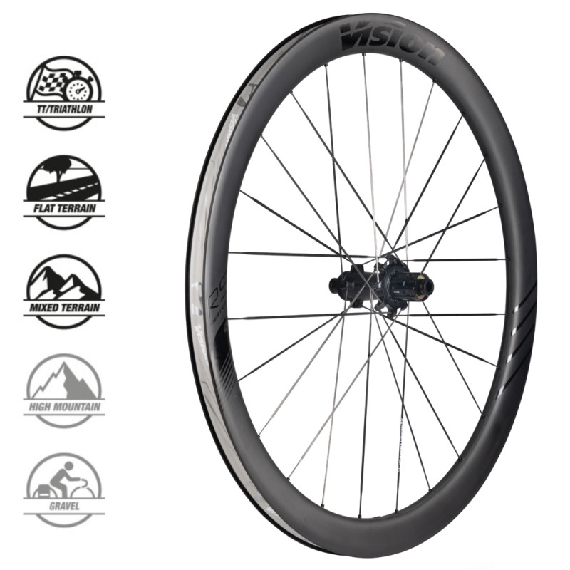 Die vollständig aus Carbon gefertigten Vision Metron 45 RS dienen der Maximierung von Geschwindigkeit, Steifigkeit und Leichtigkeit. Diese im Windkanal getesteten und von WorldTour-Fahrern wie denen von Bahrain, Arkea Samsic, Astana oder EF verwendeten Laufräder stellen den Gipfel der Innovation für alle Radfahrer dar. Diese Laufräder eignen sich perfekt für unebene und flache Strecken, aber auch für Triathlons und bieten eine außergewöhnliche Aerodynamik.