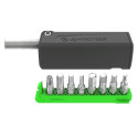 Der Greenslide 9 verfügt über einen einziehbaren Bitshalter, der eine perfekte Hebelwirkung bietet. Dieses Modell mittlerer Größe verfügt über 9 integrierte Bits, darunter ein System zum Halten von Kettengliedern sowie TORX- und HEX-Bits.