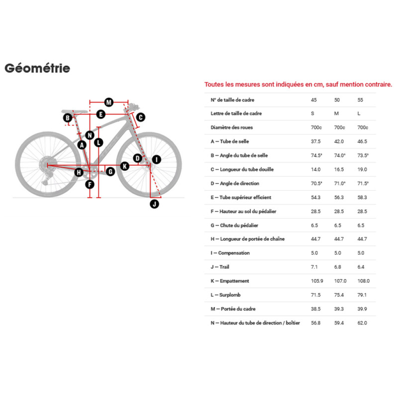 - Fourche: FX alliage d’aluminium, freins à disque à fixation Flat-Mount, fixations pour porte-bagages, hauteur de fourche de 410 mm, QR ThruSkew 5 mm
