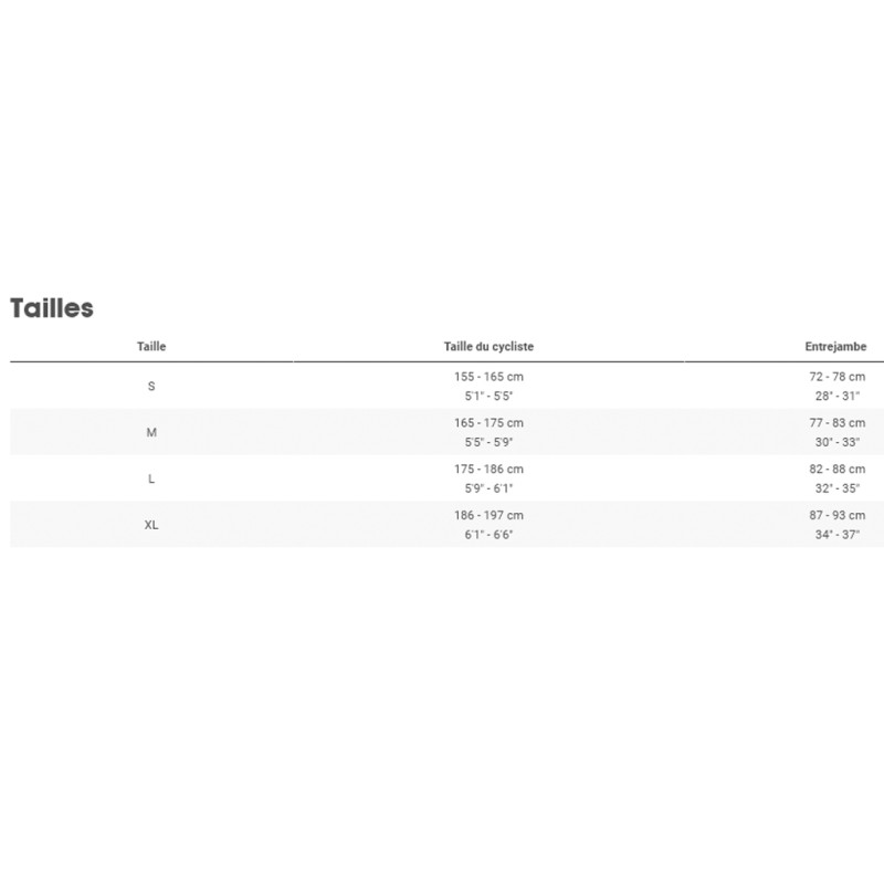 | Taille | Taille du cycliste | Entrejambe |