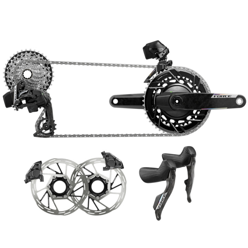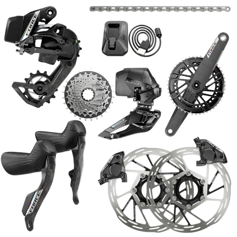 ¤- Komplette SRAM Force AXS E1-Gruppe: Force AXS-Schaltwerk, Force AXS-Umwerfer, HRD-Brems-/Schaltgriffe (Hydraulic Road Disc), SRAM Force Flattop-Kette, Scheibenbremssättel, Bremsscheiben, Ladegerät, Sram Force E1-Kassette, Sram Force E1-Kurbelgarnitur