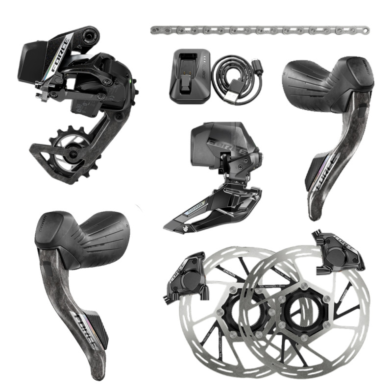 ¤- Elektrischer Teil der SRAM Force AXS E1-Gruppe: Force AXS-Schaltwerk, Force AXS-Umwerfer, HRD-Brems-/Schaltgriffe (Hydraulic Road Disc), SRAM Force Flattop-Kette, Scheibenbremssättel, Bremsscheiben, Ladegeräte