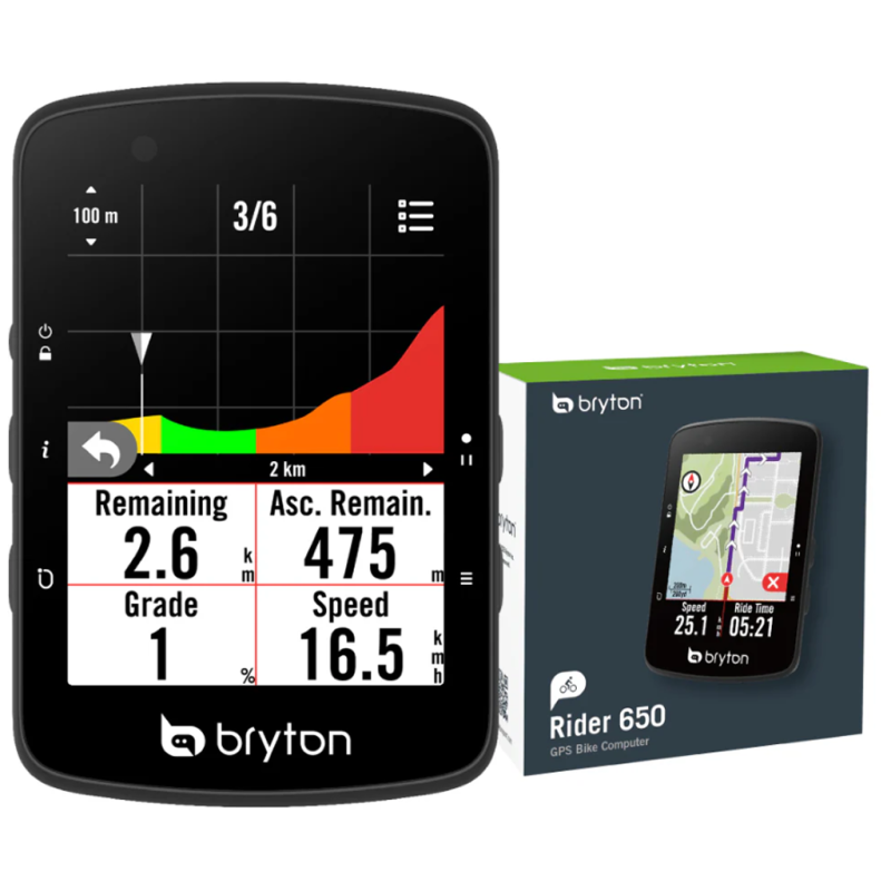 Der Bryton Rider 650 E definiert das GPS-Erlebnis beim Radfahren neu dank seines 2,8-Zoll-Farb-Touchscreens, seiner 33-stündigen Akkulaufzeit und seiner fortschrittlichen Funktionen. Mit der Climb Challenge bietet er eine detaillierte grafische Darstellung der Anstiege mit Entfernung, Steigung und Höhenunterschied. Außerdem verfügt er über einen Umgebungslichtsensor, ein anpassbares Schnellstatusmenü und eine Turn-by-Turn-Navigation mit OSM-Karten.
