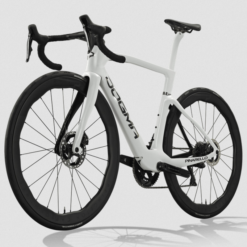- Sattelstütze: Pinarello Aero mit 3D-gedruckter Sattelschelle aus Titan Flaschenhalter: Most Trap PACF und Elite Fly 550 ml-Flasche in Schwarz Laufräder: