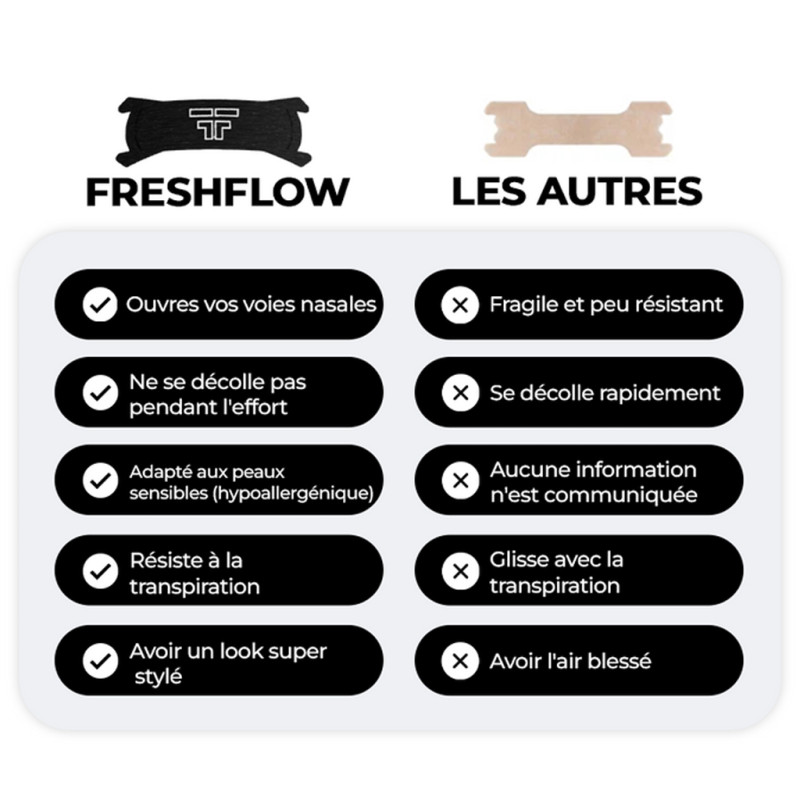 Das FreshFlow White ist in einer weißen Version für den Sportbereich mit einem schweißresistenten Klebstoff erhältlich und ein Nasenband, das speziell für Sportler entwickelt wurde. Durch die Erweiterung der Nasenlöcher erleichtert dieses Band den Lufteintritt und sorgt so für eine bessere Sauerstoffversorgung des aktiven Gewebes. Ideal für Radfahrer, die unter einer verstopften Nase leiden, sorgt dieses FreshFlow White für eine flüssigere Atmung. Es dient auch einer beschleunigten Regeneration, indem es die Sauerstoffversorgung optimiert, um eine schnelle und effektive Heilung zu erreichen. Das Band unterstützt Ihre Erholung, indem es Schnarchen mindert und so für ruhigere und erholsamere Nächte mit freien Nasengängen sorgt. Dank all dieser Eigenschaften verleiht Ihnen dieses FreshFlow White Nasenband mehr Energie für Ihre Leistung auf dem Fahrrad. Anwendungshinweise: Reinigen und trocknen Sie zunächst Ihre Nase sorgfältig, um eine gute Haftung zu gewährleisten. Entfernen Sie anschließend vorsichtig die Schutzfolie. Legen Sie das Band dann entlang des Nasenrückens an und achten Sie darauf, dass es gut zentriert und befestigt ist. Es wird empfohlen, dieses Nasenband während einer Radtour zu tragen, um Ihre Leistung zu optimieren, oder während des Schlafs, um sich besser zu erholen. Jedes Nasenband ist zum einmaligen Gebrauch bestimmt, um maximale Hygiene und Wirksamkeit zu gewährleisten. Jedes Band kann bis zu 20 Stunden lang getragen werden. Technische Daten: - Farbe: Weiß