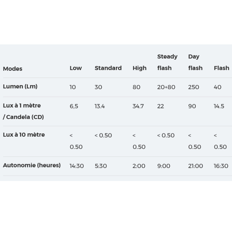 - Leuchtmodi: Niedrig, Hoch, Blinken, Tageslicht, Gleichmäßiges Blinken