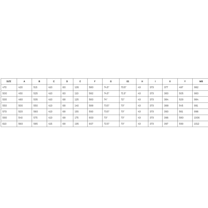 - Vorbau: Velomann, Aluminium 6061, Neigung - 7°; Ausfall: 80 mm – 44 cm, 90 mm – 47/50 cm, 100 mm – 53 cm, 110 mm – 55/57 cm, 120 mm – 59/61 cm