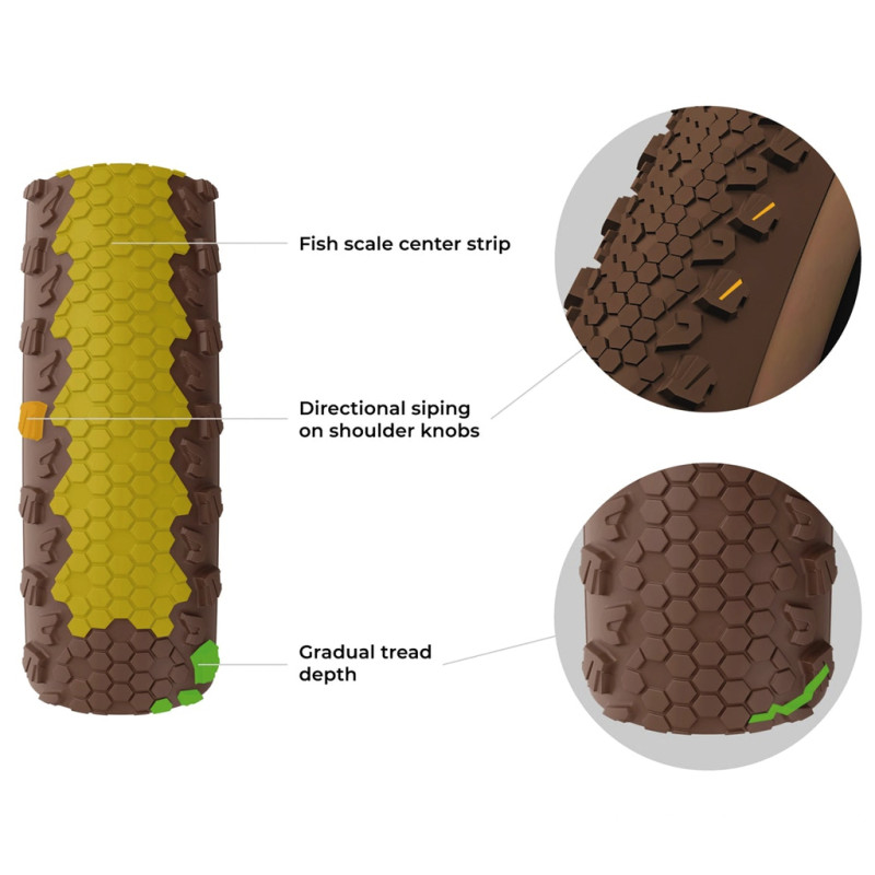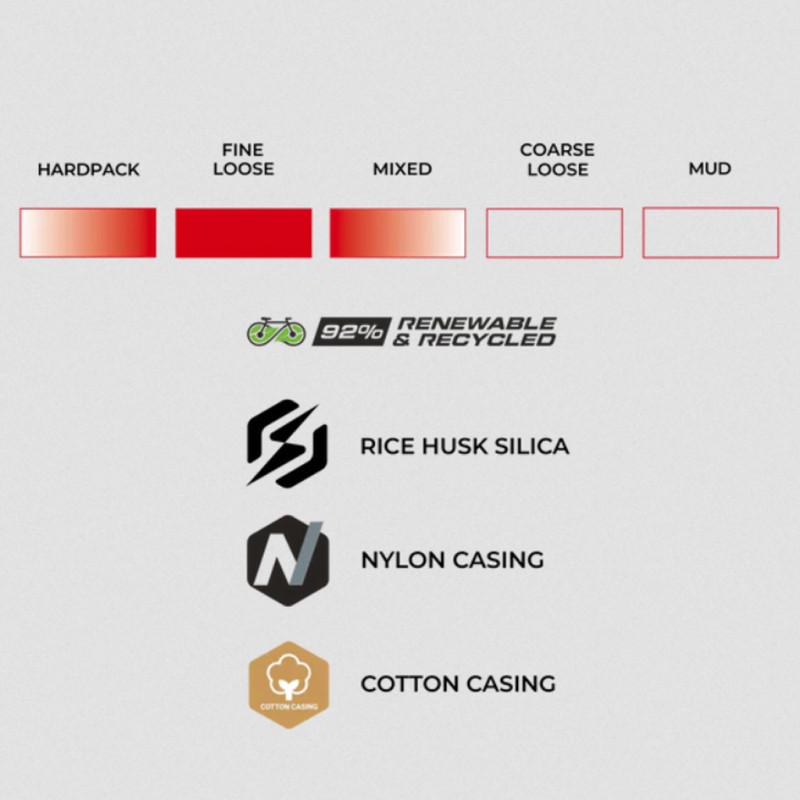 Dieser Terreno Pro T30 Fine Loose Gravel Race besteht zu 92 % aus erneuerbaren und recycelten Materialien und gehört zu den nachhaltigsten Reifen, die Vittoria je hergestellt hat. Dieser Reifen ist auf Geschwindigkeit auf trockenen und schnellen Strecken optimiert und verfügt über einen Mittelstreifen in Fischschuppenform, um den Rollwiderstand zu minimieren. Die lamellierten Seitenstollen sorgen für optimalen Grip in Kurven und beim Bremsen. Dank seines aggressiven Profils bietet dieser Reifen einen flüssigen Übergang beim Einfahren in Kurven. Schneller und griffiger dank seiner speziell für Gravel-Wettkämpfe entwickelten Gummimischung der neuesten Generation ist dieser Vittoria Terreno Pro T30 Fine Loose Gravel Race zudem pannensicherer. Die mehrschichtige Karkasse aus Bio-Baumwolle ist mit Latex verstärkt und sorgt für ein geschmeidiges Fahrgefühl. Der Seitenwandgürtel aus Seawastex-Nylon, das aus recycelten Fischernetzen hergestellt wird, sorgt für zusätzliche Festigkeit, während der verstärkte Wulst eine zusätzliche Schicht für erhöhten Schutz bietet. Dieser braune Naturreifen ist nicht nur leistungsstark und widerstandsfähig, sondern denkt auch an den Planeten, dank dem Sie die Gravel-Strecken in vollen Zügen genießen können. Technische Daten: - Farbe: Naturbraun