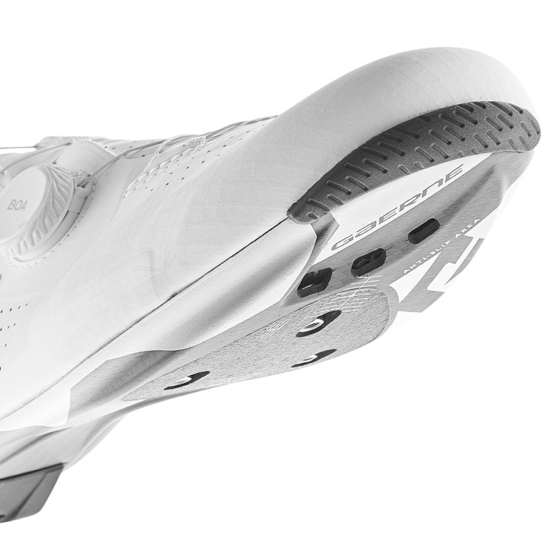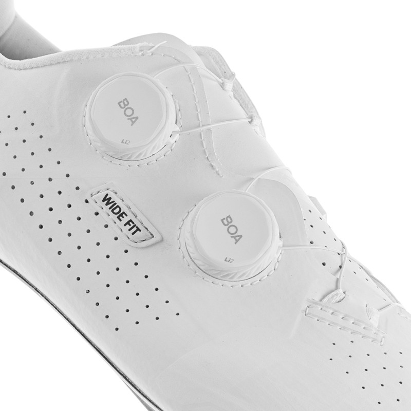 Diese Gaerne G.Jet Wide vereinen Technologie, Stil und Leistung und sind bereit, sich allen Herausforderungen zu stellen, die Sie ihnen stellen. Diese Wide-Version bietet im Vergleich zur G.Jet-Version eine größere Weite, um den Bedürfnissen von Radfahrern gerecht zu werden, die mehr Platz im Vorfußbereich benötigen. Diese Schuhe stecken voller Qualitäten: Sie bieten vor allem maximale Leistung dank einer Lightweight Full Carbon Sole, die aus einem optimierten Carbonfasergewebe gefertigt ist. Neben der Übertragung jedes Watts an tatsächlicher Kraft auf die Pedale dank ihres Steifigkeitsindex von 12 sorgt diese Sohle auch für eine gute Fußstabilität durch eine spezielle Form im Bereich des Fußgewölbes. Diese Gaerne G.Jet Wide verfügen über 4 Belüftungsöffnungen, um eine gute Belüftung zu gewährleisten. Diese Sohle ist zudem mit einer rutschfesten Einlage an der Spitze und einem Polster im Fersenbereich ausgestattet und bietet gleichzeitig einen Einstellbereich für die Schuhplatten. Der Schaft ist aus einem Stück gefertigt und verfügt über Laserperforationen, um eine gute Wärmeableitung zu gewährleisten. Die atmungsaktive EPS-Leichtbau-Einlegesohle bietet maximalen Komfort im Fußwurzelbereich. Das Tarsal Support System 1.0 formt den Schaft und umschließt die Ferse fest, um eine verbesserte Kontrolle zu gewährleisten. Das Infit-Verschlusssystem und die BOA Li2-Drehradien garantieren schließlich eine schnelle und präzise Passform und verleihen diesen sehr stilvollen Gaerne G.Jet Wide White ein elegantes Design. Technische Daten: - Farbe: Weiß