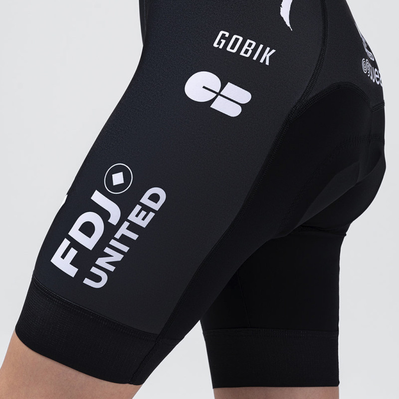 Um nach dem Kauf des neuen Trikots des Frauenteams FDJ United Suez ganz wie Demi Vollering, Évita Muzic, Célia Gery oder Juliette Labous auszusehen, sollten Sie sich für diese Gobik Limited 6.0 entscheiden! Entwickelt für Radfahrer, die Komfort suchen, ohne auf Leistung zu verzichten, bietet diese Radhose dank ihres leichten und atmungsaktiven Lycra-Materials eine mittlere Kompression. Perfekt für Fahrten bei sommerlicher Hitze, verfügt sie über perforierte, breitere und leichtere Träger, die für gute Belüftung sorgen und den Druck gleichmäßig auf die Schultern verteilen. An den Beinen sorgt ein 60 mm hoher Haltebund mit Laserschnitt und einer Silikonbeschichtung auf der Innenseite für einen sicheren Sitz und optimalen Halt. Diese Radhose ist dank ihres speziell für die weibliche Anatomie entwickelten K9-Sitzpolsters äußerst bequem. Dieses Sitzpolster besteht aus Schaumstoffen unterschiedlicher Dichte mit elastischem Gedächtnis, einem zentralen Kanal zur Verbesserung der Durchblutung und einem Gewebe aus Graphenfasern, um das Wachstum von Bakterien zu verhindern. Abgerundet wird diese Gobik Limited 6.0 FDJ Suez 2026 durch reflektierende Details, die diese Profi-Radhose zur Grundlage Ihrer Sommer-Radsportbekleidung machen. Technische Daten: - Farbe: FDJ United Suez 2026