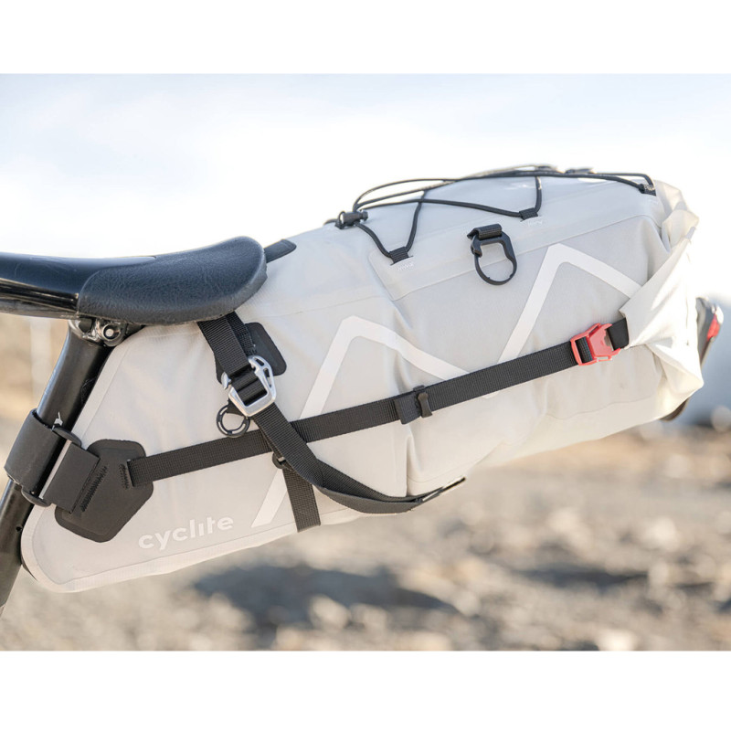 Die Cyclite Saddle Bag / 02 ist eine ultraleichte Bikepacking-Satteltasche mit 12,9 Litern Fassungsvermögen, die für lange Strecken und Abenteuer in Eigenregie konzipiert ist. Sie besteht aus doppelseitigem recyceltem LiteGrid-RN200T3-Nylon mit Hochfrequenzverschweißungen und garantiert absolute Wasserdichtigkeit und hohe Robustheit bei einem Gewicht von nur 356 Gramm. Ihr exklusives SR-Befestigungssystem kombiniert Aluminiumhaken mit einem zentralen Carbonfaserband und verhindert so jegliches seitliches Schwanken, selbst im Stehen. Der Rollverschluss verfügt über ein Kompressionsventil zur Volumenoptimierung. Elastische Riemen an der Oberseite ermöglichen die Befestigung von zusätzlichem Material, und eine Befestigungsmöglichkeit für ein Rücklicht ist integriert. Von den Magazinen TOUR und RennRad hochgelobt, ist diese Tasche die erste Wahl für anspruchsvolle Ultracyclisten. Technische Daten: - Einsatzbereich: Bikepacking, Gravel, Langstrecken-Straßenradfahren, Ultracycling