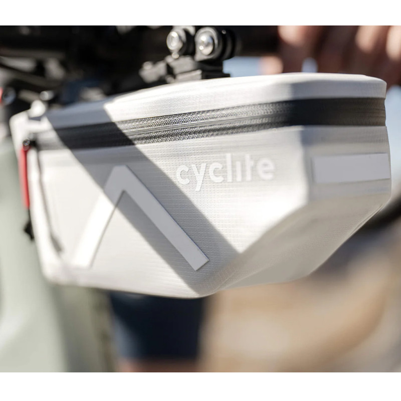 Die Cyclite Handle Bar Bag Nano 01 ist eine Lenkertasche für Radfahrer, die alles haben wollen: viel Stauraum, ohne dabei an Leichtigkeit oder Aerodynamik einzubüßen. Mit ihren 98 Gramm und einem Volumen von 1,3 Litern bietet sie Platz für eine Regenjacke, eine Weste, Verpflegung oder kleines Werkzeug und bleibt im Luftstrom nahezu unsichtbar. Ihre minimalistische Form fügt sich unauffällig in jede Art von Fahrrad ein, egal ob Rennrad oder Gravelbike. Was den Nano 01 auszeichnet, ist sein innovatives Magnetbefestigungssystem, das das Anbringen und Abnehmen mit einem einzigen Handgriff ermöglicht – ohne Werkzeug und ohne festzuziehen. Das von Cyclite intern entwickelte Material LiteGrid-RN200T3, kombiniert zwei Lagen recyceltes Nylon (PA/N6.6 200D Ripstop), die hochfrequenzverschweißt und beidseitig beschichtet sind: Das Ergebnis ist ein Stoff, der ultraleicht, wetterfest und pflegeleicht ist. Der breite, umlaufende Reißverschluss garantiert schnellen Zugriff, auch während der Fahrt. Die Handle Bar Bag Nano 01 ist in zwei Farben erhältlich: Light Grey und Black. Sie wird mit der Nano Universal Mount und dem Nano Computer Mount Adapter geliefert, für eine sofortige Montage unter kompatiblen Aero-Cockpits oder unter Tachohalterungen mit GoPro-Klemme. Für die Befestigung an einem klassischen Rundlenker ist die Nano Handle Bar Mount separat erhältlich. Technische Daten: - Disziplin: Straße, Gravel, Bikepacking