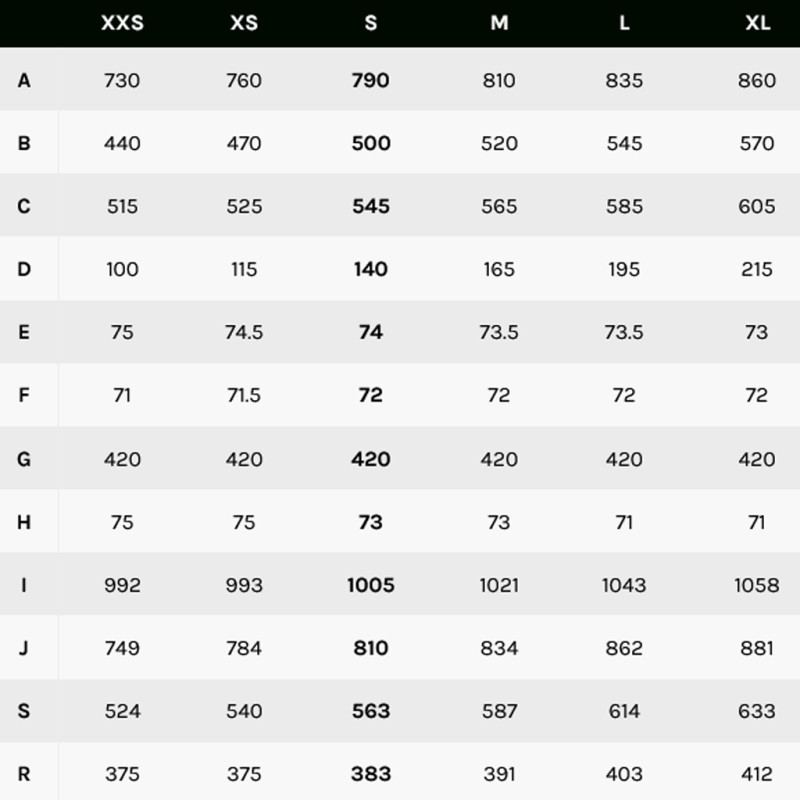 (mm) XS S M L XL A 540 563 587 614 633 B 375 383 391 403 412 C 115 140 165 195 215 D 470 500 520 545 570 E 525 545 565 585 605