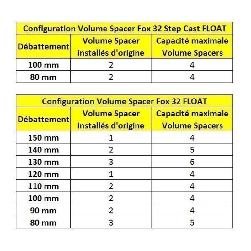 1 - Note the pressure of your fork 2 - Remove all the air from the cartridge 3 - Remove the valve 4 - Attach the desired number of Volume Spacers under the valve 5 - Replace the valve on the fork tee. 6 - Repressurise the fork. At equivalent pressure, the fork's behaviour will differ depending on the number of Volume Spacers, so it may be necessary to adjust it.¤