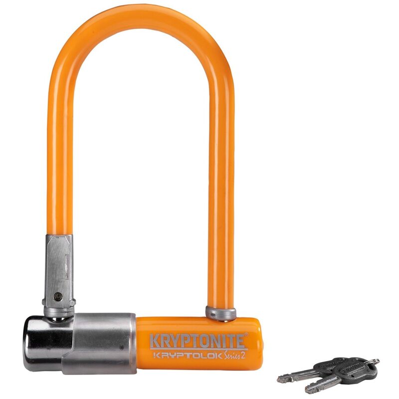 The Kryptonite Kryptolock Series 2 U-lock is suitable for medium-length stops in the suburbs and short stops in the city. It has undergone several improvements to optimise its resistance to twisting, cutting and drilling. The shackle is made of 13 mm thick Max-Performance steel. Its ends are reinforced for improved reliability. The locking system has been reinforced and optimised for easier use. A frame attachment is also provided for greater convenience during transport. Technical specifications- 13 mm Max-Performance steel shackle with vinyl coating - Reinforced cylinder with dust cover - Reinforced shackle ends - 2 ergonomic keys - Frame attachment provided- Colour: Orange - Security level: 6/10- Weight: approx. 1.11 kg