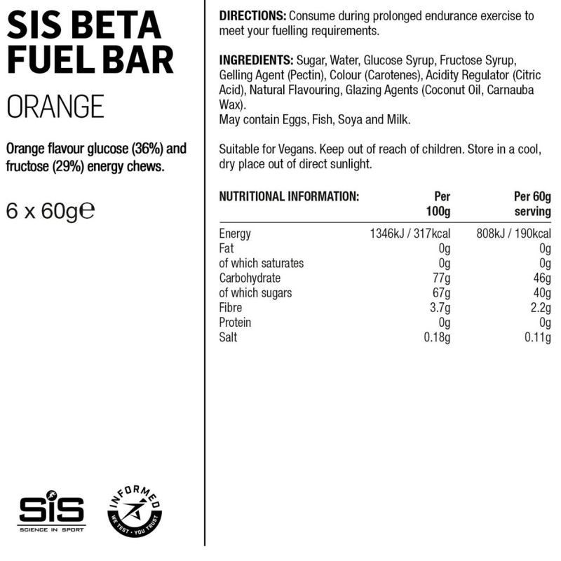 The new Beta Fuel range from SIS Science in Sport has been developed with advice from top athletes. SIS Beta Fuel Orange is a dual-energy bar. Thanks to its maltodextrin and fructose content (1:0.8), it improves cyclists' energy levels while increasing the efficiency of carbohydrate use without causing gastrointestinal discomfort. Its fruit paste texture makes it easy and tasty to chew during exercise. This Beta Fuel Orange Energy Gum bar is quickly absorbed in your intestine, providing a rapid source of energy.