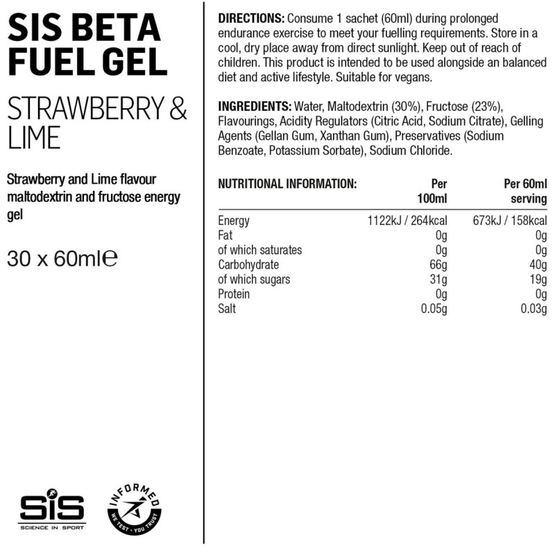 It is easy to use: simply tear off the top of the packaging and squeeze the contents into your mouth. This gel is practical, fits perfectly in a pocket and is unlikely to open during use.Technical specifications: Each 60ml tube of SIS Beta Fuel Gel Strawberry-Lime contains 40g of carbohydrates with a brand new 1:0.8 ratio (maltodextrin to fructose). This gel uses natural flavours and contains no colourings or preservatives.