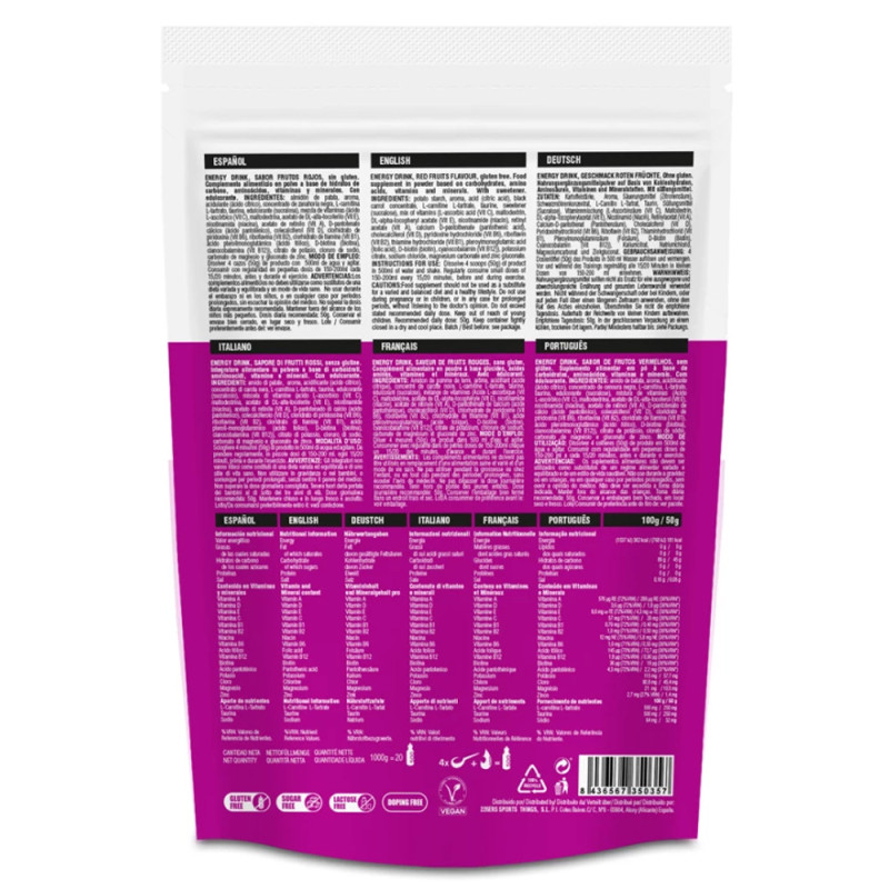 Ingredients: Potato starch, flavouring, acidifier (citric acid), black carrot concentrate, L-carnitine L-tartrate, taurine, sweetener (sucralose), vitamin mix (L-ascorbic acid (Vitamin C), maltodextrin, DL-alpha-tocopheryl acetate (Vitamin E), nicotinamide (niacin), retinyl acetate (Vitamin A), calcium D-pantothenate (pantothenic acid), cholecalciferol (Vitamin D), pyridoxine hydrochloride (Vitamin B6), riboflavin (Vitamin B2), thiamine hydrochloride (Vitamin B1), pteroylmonoglutamic acid (folic acid), D-biotin (biotin), cyanocobalamin (Vitamin B12)), potassium citrate, sodium chloride, magnesium carbonate and zinc gluconate. Nutritional information: Per 50g of powder: kJ/kcal: 768/181, Fat: 0g, of which saturated fatty acids: 0g, Carbohydrates: 45g, of which sugars: 0g, Protein: 0g, Salt: 0.08g, L-Carnitine L Tartrate: 250mg, Taurine: 250mg Sodium: 32mg Vitamin content: Vitamin A: 288mg RE, Vitamin D: 1.8mg, Vitamin E: 4.3mg a-TE, Vitamin C: 29mg, Thiamine: 0.40mg, Riboflavin: 0.50mg, Niacin: 5.8mg NE, Vitamin B6: 0.5mg, Vitamin B12: 0.9mg, Folic acid: 72.7mg, Biotin: 18mg, Pantothenic acid: 2.2mg. Mineral content: Potassium: 57.7mg, Chlorine: 45.4g, Magnesium: 10.5mg, Zinc: 1.4mg. Recommended use: Dilute 4 scoops (50g) of product in 500ml of water and shake. Consume regularly in small doses of 150-200ml every 15/20 minutes, before and during exercise.