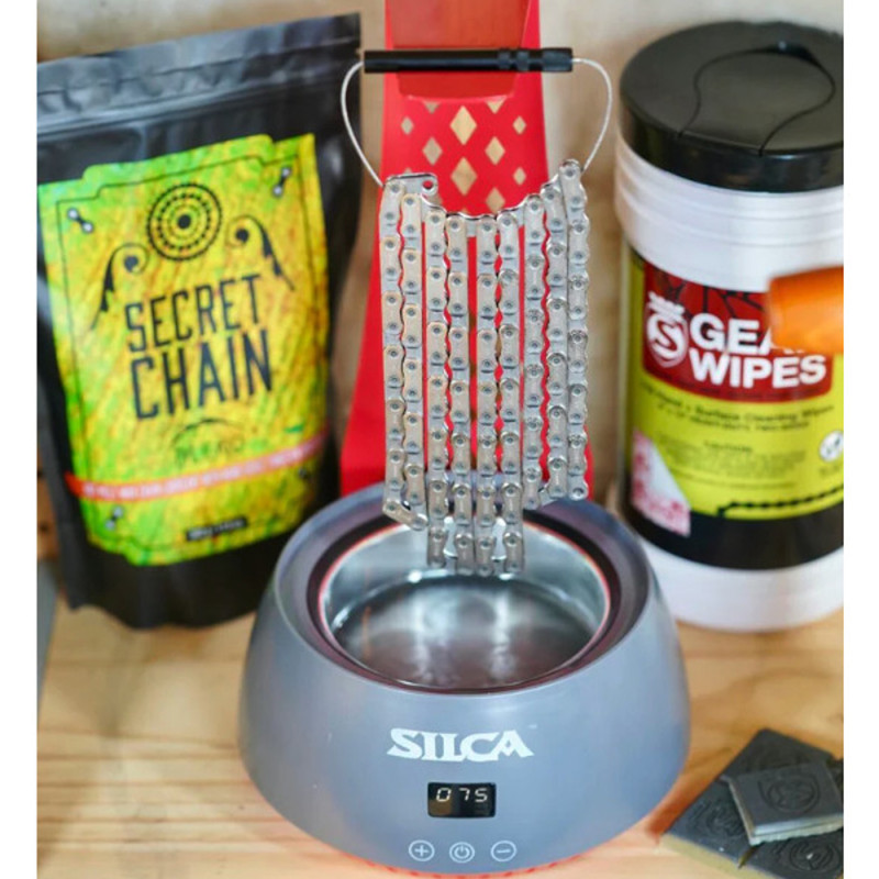 If you want your racing bike to be in perfect condition so you can perform at your best in all the races in your region or national cycling events, this Silca Chain Waxing system is the kit you need. Designed for home use, this wax melter will make your chain cleaner, quieter and more efficient. Perfect for deep waxing your chain without using degreaser, this 600ml wax heater has a transparent vented lid to retain heat. The drip tray is used to hang the chain to ensure discreet drying without wax loss. Thanks to this comprehensive system, your chain is immersed in hot wax, moved and hung up so that it can perform at its best, for example by reducing friction.Technical specifications:¤