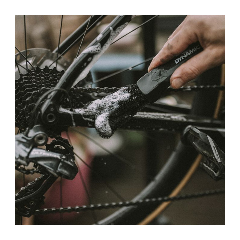 - The Dynamic Two Prong Brush is specially designed to reach narrow and hard-to-reach areas of your bike, such as derailleurs and sprockets. Its two-prong design allows for precise and effective cleaning of small parts of the drivetrain. Used by professional teams such as Bora Hansgrohe, FDJ Suez and Alpecin Deceuninck, it ensures high-quality maintenance to keep bikes in perfect condition. The brush is made with durable nylon bristles, offering a long service life even after multiple cleanings. Thanks to its light weight and ergonomic design, it allows for comfortable and prolonged use, even for the most delicate details. Technical specifications Lightweight cleaning brush for drivetrains- Ergonomic handle with two branches - Durable and resistant nylon bristles - Suitable for reaching hard-to-reach areas - Perfect for cleaning fine components - Ideal for all types of bicycles- Robust and wear-resistant design - Easy to clean after each use - Brand: Dynamic