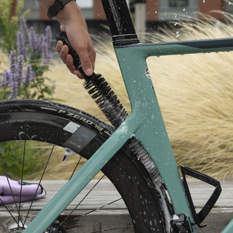 The Dynamic cleaning brush is specially designed to effectively clean all surfaces of the bike, such as frames and wheels, thanks to its extra-long handle and sturdy nylon bristles. Used by professional teams such as Bora Hansgrohe and FDJ Suez after their races, it allows for quick and thorough cleaning. This brush is resistant to cleaning chemicals, ensuring long-lasting durability even with frequent use. Ideal for keeping equipment in perfect condition after every competition. Technical specifications - Designed to clean all surfaces, including the entire bicycle- Sturdy, long nylon bristles