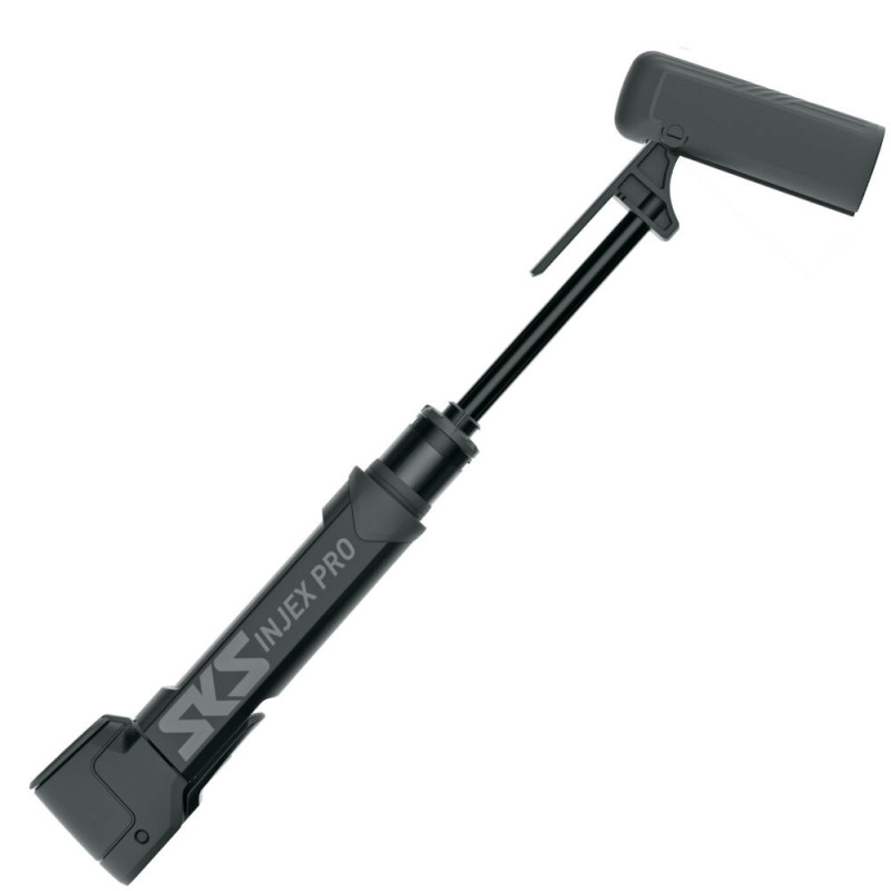 The SKS Injex Pro 10 bar hand pump has a sophisticated ergonomic design that offers a better grip. The 5-degree angle of the inflation head makes inflating tyres considerably easier, as does the 60-degree angled T-handle, which aligns the forearm and the pump. This allows you to reach a high pressure in the tyre more quickly and easily. The MV EASY head is suitable for all types of valves and promises efficient inflation. Technical specifications:- Activated telescopic function - 2-component handle with textured surface - Angled T-handle - MV EASY valve head for all types of valves - Materials: aluminium and plastic- Weight: 223 g - Valve connection: Presta, Schrader, Dunlop - Max. pressure: 10 bar / 145 PSI - Length: 266 mm - Made in Germany