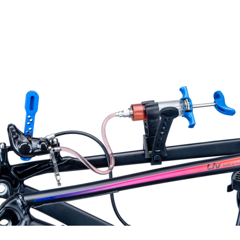 The kit includes two 20 mL syringes, bleed hose with caps, universal and specific cages (10/11/12 mm), a closed funnel, a clever syringe holder, and a wide selection of threaded tips (M4 to M7) to fit all existing standards. Each part is replaceable, ensuring longevity and controlled usage costs. The BKM-1/1.2 kit stands out for its extreme versatility, incorporating adapters for all mineral oil standards and providing total coverage of common systems. It includes a clever syringe holder that keeps the tool in a vertical position for leak-free purging without the need for an extra hand. The 20 mL syringes are designed for intensive use, are easy to clean and durable. Everything is transported in a sturdy case, allowing for an optimised mobile or fixed workshop. Finally, the replaceability of parts (hoses, seals, nozzles, etc.) ensures low maintenance costs in the long term. Technical specifications Reference: BKM-1.2¤pType of purge: Mineral oil¤pSyringes: 2 × 20 mL, removable for cleaning¤pHoses: 2 × with retaining clips, 1 × rigid for Shimano, 1 × open outlet Adapter tips: M4 x 0.7 (SRAM DB8/Trick Stuff/Campagnolo) ×2 M5 x 0.8 (Hayes, Formula, Tektro) ×2 M6 x 0.75 (Magura) ×1