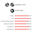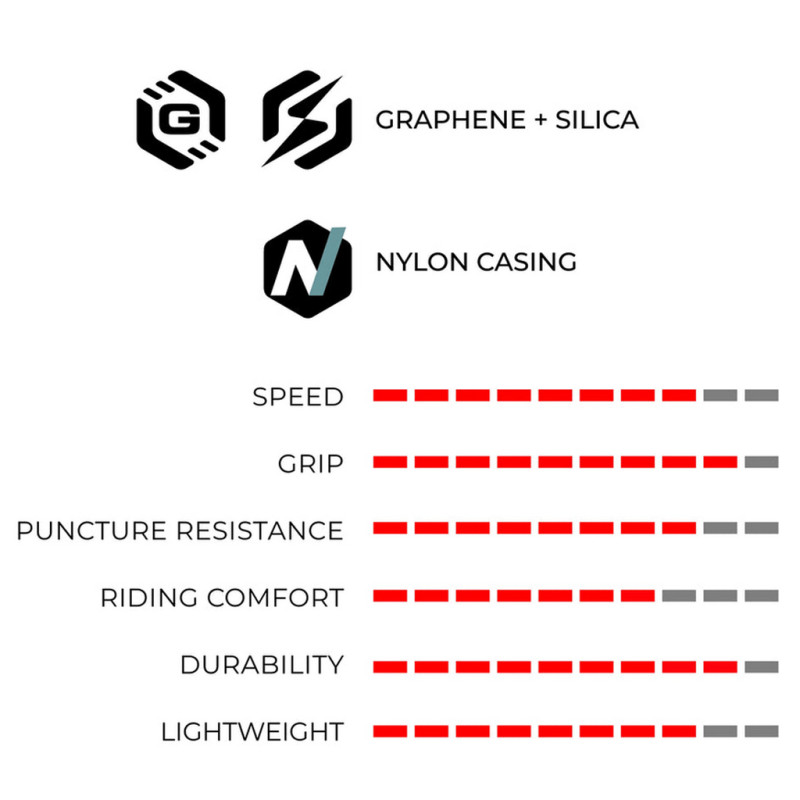 - Rubber: Graphene + Silica for grip, durability and puncture resistance