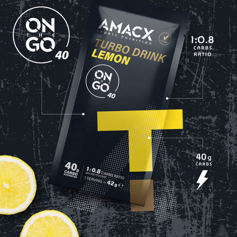 Amacx Turbo Drink On The Go, with 40g of carbohydrates per sachet and essential electrolytes, effectively replenishes your energy reserves during long efforts. Developed with the pros and used by the biggest teams in the peloton, it combines performance and digestibility.