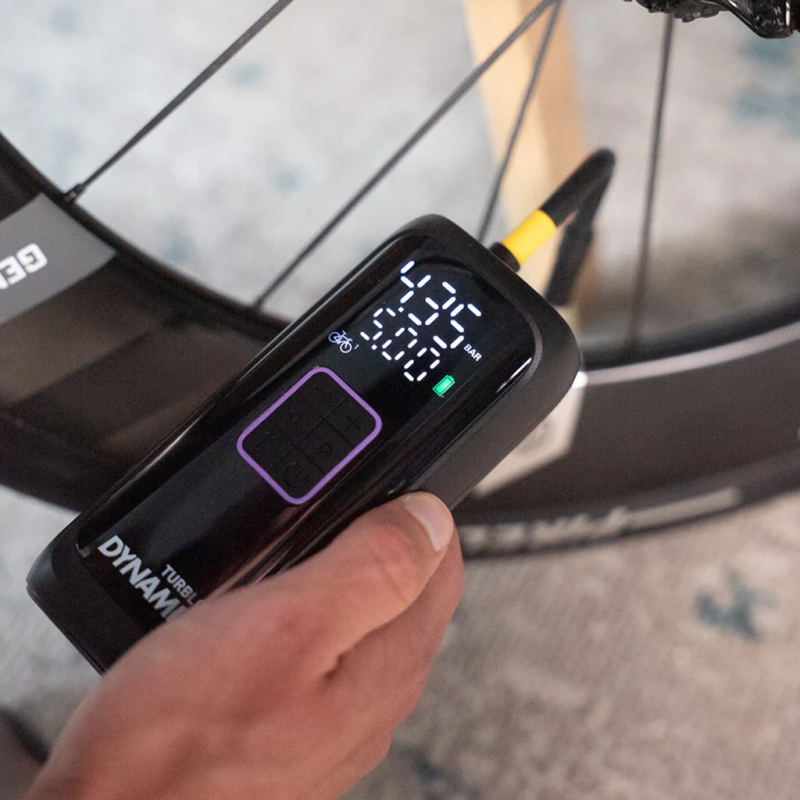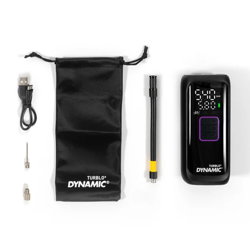The Dynamic Turblo+ mini electric pump is the ultimate solution for cyclists seeking power, precision and versatility in a compact format. Designed to meet the demands of road, gravel, mountain biking and bikepacking, it features an ultra-precise pressure sensor, automatic shut-off and the ability to save up to 4 preset pressures, ideal for switching between multiple bikes or tyre types. Its high-performance internal motor delivers an impressive airflow of 22 L/min, capable of reaching up to 10 bar / 145 PSI, whilst remaining reliable and quiet. With its 2000 mAh battery, it can inflate up to 10 road tyres or 18 MTB tyres on a single charge, and also doubles as a power bank thanks to its built-in USB-A port. Compact, robust, Presta/Schrader compatible and supplied with a full set of accessories, the Turblo+ is a must-have for training sessions, trips and races where precision leaves nothing to chance. Technical specifications - Use: Road, Gravel, MTB, Bikepacking. For use on rides or in your workshop