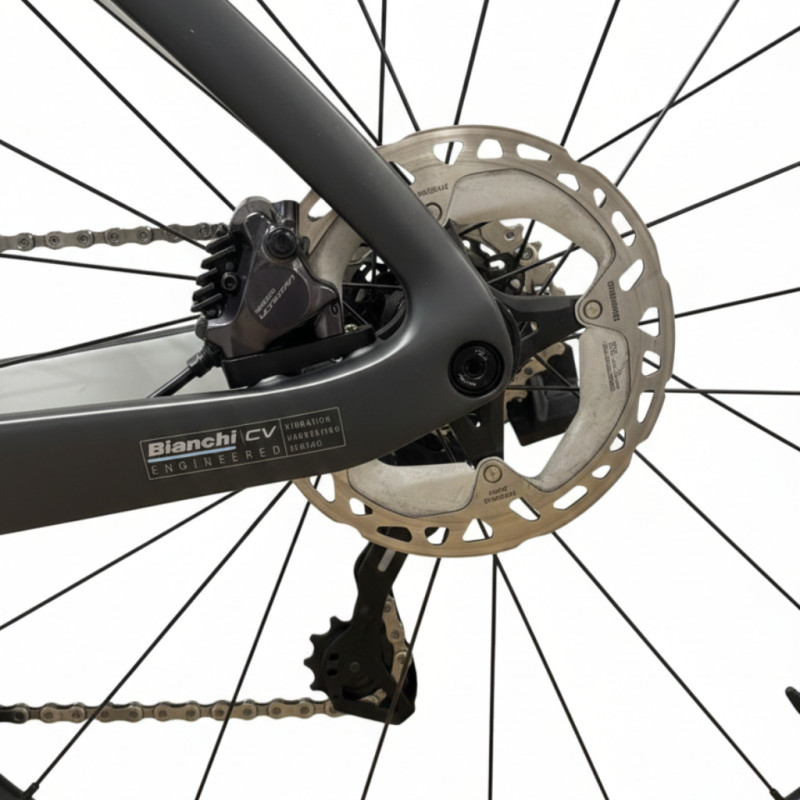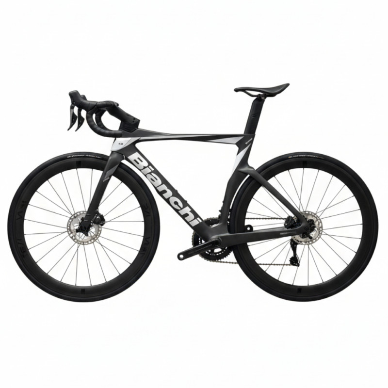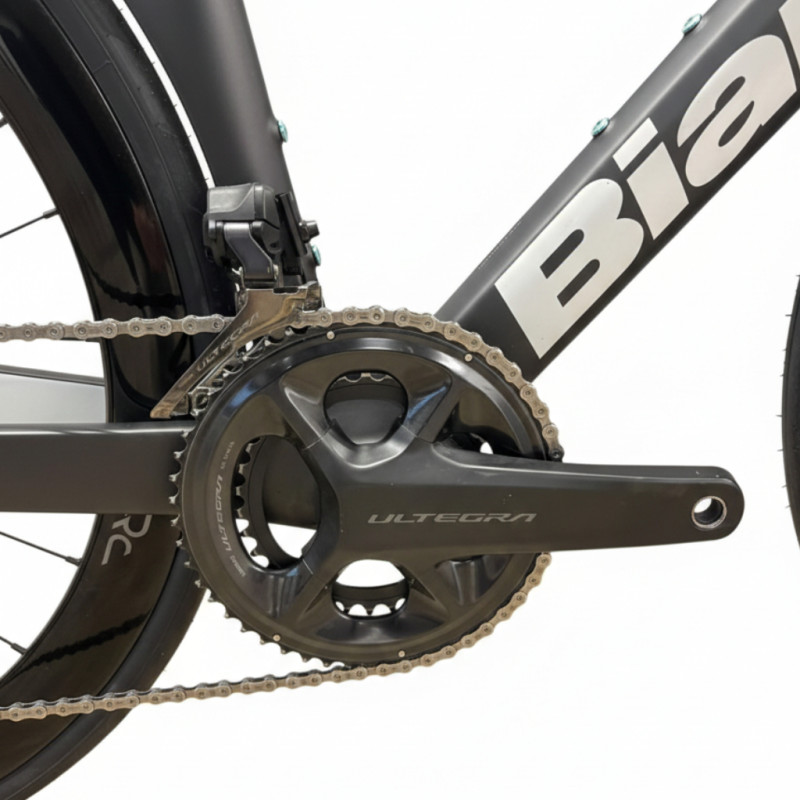 Fitted with the Shimano Ultegra Di2 12-speed groupset, it ensures fast, smooth and reliable gear changes, even under heavy load. The 50-34 compact crankset combined with an 11-30 cassette offers optimal versatility, whether on hilly terrain or fast routes. The 50mm Reparto Corse carbon wheels offer an excellent balance between aerodynamics, inertia and stability at high speeds. The carbon handlebar and hydraulic disc brakes complete a build that is resolutely performance-oriented.