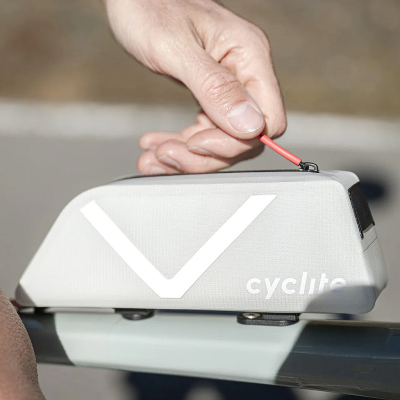 The Cyclite Top Tube Bag Nano 01 is a top tube bag designed for absolute minimalism. Weighing just 68 g and with a volume of 0.6 L, it is aimed at road and gravel cyclists who want instant access to their supplies without adding weight to their bike. Its innovative magnetic attachment (neodymium magnet) allows it to be fitted and removed in seconds, without tools. The Top Tube Bag Nano 01 is made from the proprietary Cyclite LiteGrid-RN200T3 fabric: a recycled 200D nylon (PA/N6.6) woven in a ripstop pattern using a technique that combines two different thicknesses, then double-sided coated and high-frequency welded. The result is a weather-resistant material that is easy to clean and remarkably rigid for its weight. The central waterproof zip ensures quick access to the contents even in the rain, and reflective elements provide enhanced visibility in low light. Available in two colours (light grey and black), the Cyclite Top Tube Bag Nano 01 comes with its NANO UNIVERSAL MOUNT bracket and a protective film for the frame. For bikes fitted with threaded inserts on the top tube, the NANO BOLT MOUNT is available separately. It is compatible with the entire CYCLITE pannier range. Technical specifications: - Discipline: road, gravel, bikepacking - Use: top tube bag for supplies (gels, energy bars) - Main material: LiteGrid-RN200T3 — 200D recycled PA/N6.6 ripstop, double-sided coated, high-frequency welded - Other materials: TPU, POM, Hypalon, HDPE, waterproof zip, reflective film, neodymium magnet - Closure: central waterproof zip - Mounting system: magnetic (neodymium magnet) via NANO UNIVERSAL MOUNT (O-rings) - Alternative mounting: NANO BOLT MOUNT (sold separately) for frames with threaded inserts - Available colours: light grey, black - Weather resistance: yes - Reflective elements: yes - Cable outlet: yes (protected) Technical specifications: - Weight: 68 g - Storage volume: 0.6 L Contents: - 1 × Top Tube Bag Nano 01 - 1 × NANO UNIVERSAL MOUNT - 1 × frame protection film - 1 × instruction booklet Compatibility guide: The Cyclite Top Tube Bag Nano 01 fits all standard top tubes thanks to the included NANO UNIVERSAL MOUNT and O-rings. This universal mount adapts to the round, oval or profiled tubes of modern road and gravel bikes. For bikes equipped with threaded inserts on the top tube, the NANO BOLT MOUNT (sold separately) allows for direct attachment to the frame’s threaded points, providing an even more stable and permanent fit. FAQs 1. Does the bag really stay in place at high speeds or on rough roads? Yes. The neodymium magnetic mounting system is designed to keep the bag securely attached to the top tube, even on rough roads or at high speeds. For the most demanding conditions, the NANO BOLT MOUNT (sold separately) offers a screw-on attachment directly to the frame’s threaded inserts, providing even greater security. 2. What can you fit into 0.6 L? The 0.6 L capacity is ideal for 2 to 3 energy gels, 1 to 2 bars, a compact phone or documents (map, cash). This ultra-compact size is not intended for carrying bulky items: for greater storage needs, Cyclite offers the Medium and Large versions of the Top Tube Bag. 3. Is the zip really waterproof? The Top Tube Bag Nano 01 features a waterproof zip and its LiteGrid-RN200T3 fabric is double-sided coated and weather-resistant. It is designed to withstand rain and splashes. It is not a fully submersible bag, but it effectively protects its contents in normal to challenging weather conditions. 4. How do I clean the bag? Thanks to the double-sided coating on its LiteGrid-RN200T3 fabric, the Top Tube Bag Nano 01 is easy to clean: a quick wipe with clean water and a soft sponge is usually sufficient. Avoid machine washing and harsh detergents, which could damage the coating and the fabric’s waterproof properties. 5. Is the frame protection film essential? The protective film provided protects the bike’s top tube from scuffs and micro-scratches caused by the mounting bracket. We strongly recommend applying it, particularly on frames with a matt finish, bare carbon or high-end finishes, which are more susceptible to marks.