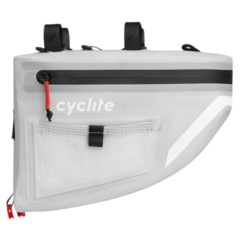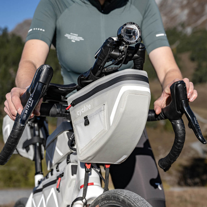 The Cyclite Handle Bar Aero Bag 02 pushes the boundaries of handlebar bags by combining a 4.9-litre capacity with a design specifically optimised to reduce aerodynamic drag. Winner of RennRad magazine’s 2024 Test Sieg award in the bikepacking bags category, it is designed for both the discerning cycle tourist and the touring cyclist seeking uncompromising performance without sacrificing load capacity. The bag’s durability and waterproofing are based on the proprietary LiteGrid-RN200T3 material (200D recycled PA/N6.6 R/S TPU/PU3): two layers of nylon joined using a ripstop weaving technique, coated on both sides and high-frequency welded. The result is an ultra-lightweight, weather-resistant fabric that is easy to clean, complemented by elements made from Hypalon, POM, PP webbing and a waterproof double-slider zip. A covered opening at the back allows a cable or hydration tube to pass through, whilst two mesh side pockets complete the organisation. Available in light grey and black, the Handle Bar Aero Bag 02 weighs 179 g without wall reinforcement (228 g in the full version) and measures 23 x 18 x 16 cm. It can be mounted on its own under handlebar extensions or in combination with the Handle Bar Roll Bag to increase storage capacity. The package includes the bag, 2 short straps, 2 long straps, an elastic loop, a frame protection film and an instruction booklet. Technical specifications: - Discipline: bikepacking, cyclosportif, cycle touring