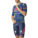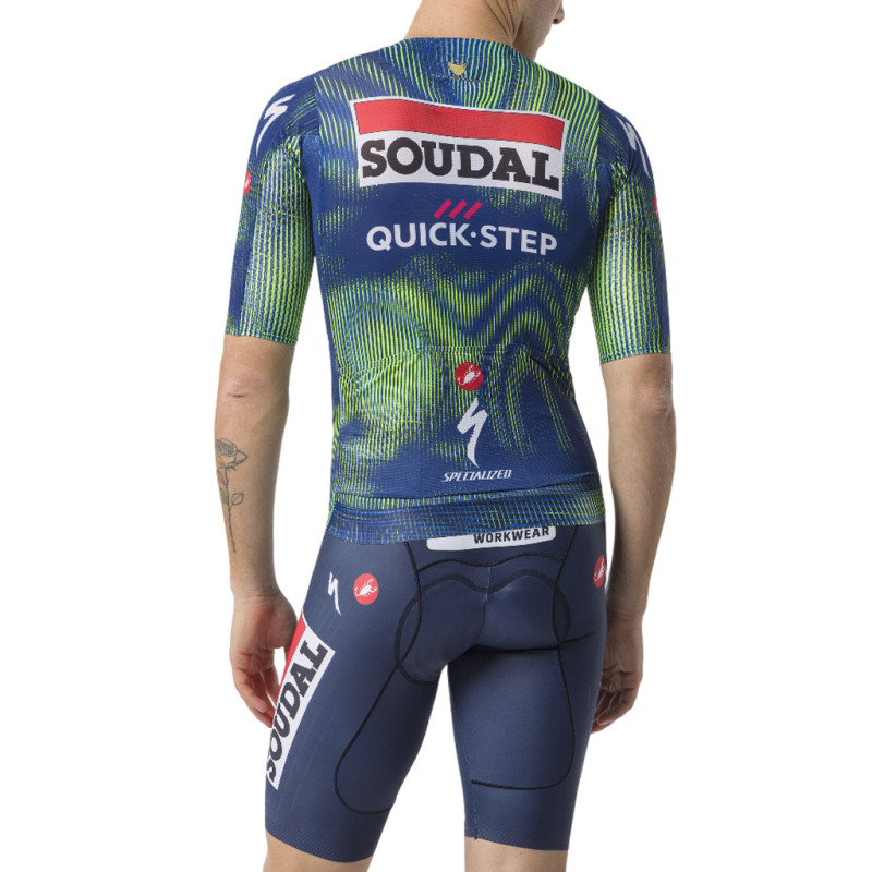The Castelli Free Aero Race S bib shorts in the Soudal Quick Step 2026 team colours are the most advanced the Italian brand has ever created. These are the bib shorts used by professional riders such as Paul Magnier and Valentin Paret-Peintre during Grand Tours, demonstrating all their performance qualities. Their premium chamois, the Progetto X2 Air Seamless, guarantees incredible comfort and breathability for long days on the bike, whether racing or training. Its Forza2 fabric moulds to the body’s contours for complete freedom of movement whilst pedalling. Providing muscle support through effective compression, these Castelli Free Aero Race S shorts also offer an aerodynamic advantage. The straps are lightweight, breathable and provide excellent support. At the bottom of the legs, a silicone band keeps the shorts in place during exercise, making these Castelli Free Aero Race S Soudal Quick-Step shorts a standout piece in your cycling wardrobe. Technical specifications: - Colour: Soudal Quick Step 2026