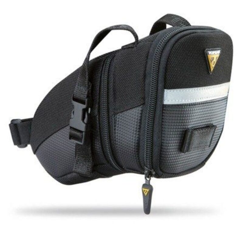 La borsa Topeak Aero Wedge Pack M è realizzata in tessuto poliestere 1200 Denari altamente resistente. È inoltre rinforzata con similpelle nella parte inferiore. Le strisce riflettenti garantiscono la sicurezza quando la visibilità è ridotta.