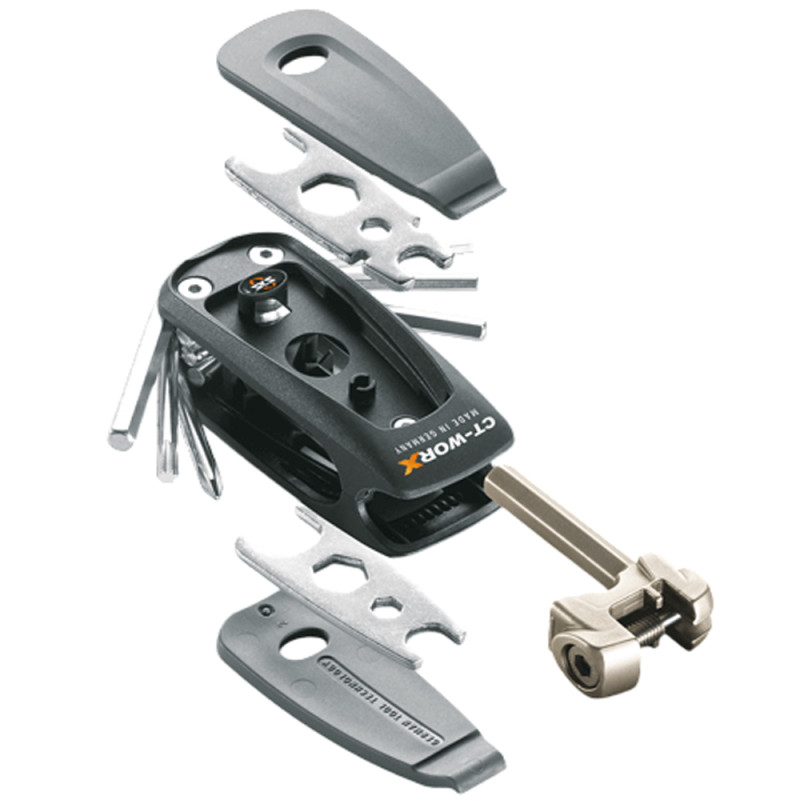 Il multiutensile CT-WORX del marchio SKS offre 20 funzioni ed è un accessorio altamente versatile, progettato per i ciclisti che cercano uno strumento completo e affidabile per le riparazioni sul campo. Offre una vasta gamma di 20 funzioni, tra cui chiavi a brugola di diverse dimensioni, cacciaviti piatti e a croce, chiavi per raggi, una chiave per svitare i pedali e un estrattore per catene. Include anche 2 levagomme. Realizzato in acciaio di alta qualità, combina leggerezza e robustezza, offrendo una grande durata anche nelle condizioni più difficili. Il suo design ergonomico garantisce una presa confortevole, mentre il suo formato compatto lo rende facile da trasportare in una tasca della maglia o in uno zaino. Questo multiutensile è ideale per i ciclisti che hanno bisogno di tutto il necessario per effettuare riparazioni, regolazioni e manutenzioni rapide durante le loro uscite.